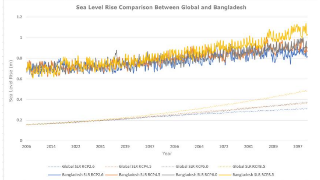 Recent satellite altimetry studies indicate that the waters of the Bay of Bengal are rising at an unprecedented rate. While the global average sea level rise is recorded at roughly 3.42 to 3.8 millimeters per year Bangladesh’s coastal zones are experiencing an average rise of 5.8 millimeters annually (Molla 2024, Yousuf 2025). Regional disparities further exacerbate this issue for instance the southeastern Chattogram and Cox’s Bazar coast is witnessing a staggering sea level increase of 6.23 millimeters per year (Yousuf 2025). By 2100 sea level rise induced flooding could encompass nearly 18 percent of the nation’s coastal zone displacing over a million people and permanently altering the geography of the delta (Molla 2024). According to the International Labour Organisation 17 percent of Bangladesh’s territory could be entirely submerged by 2050 (Ahmed 2024).